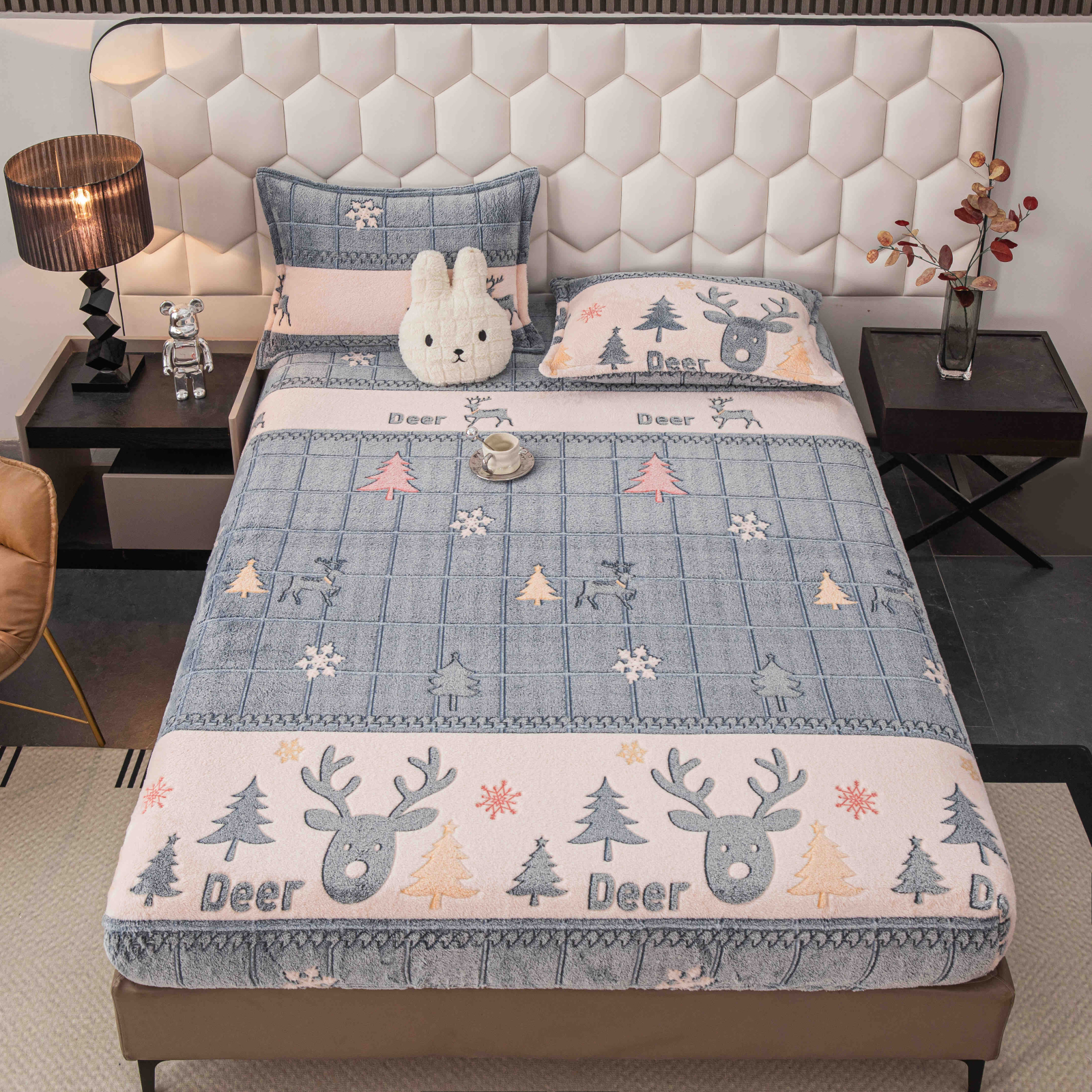 Pentru saltea 180x200 cm | Fete de perna 50x70 cm | Culoare gri/crem | Imprimeu: reni