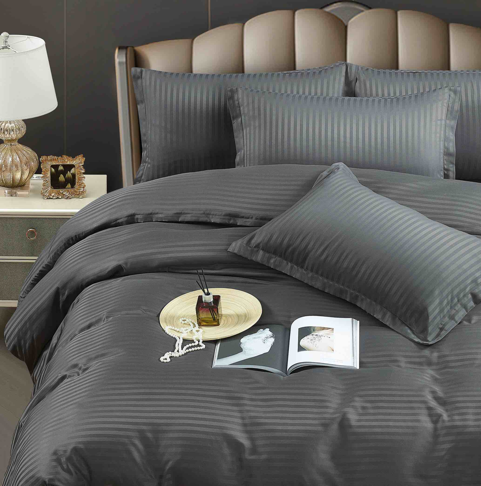 Lenjeria de pat damasc satinat cu elastic,gri inchis,potrivita pentru saltele cu dimeniunea 160x200cm si pentru cele cu dimensiunea 180x200cm marca Jojo Home este realizata din 80% polyester si 20% bumbac, tip tesatura damasc striat (cu dungile inguste 1cm) fiind considerat cel mai potrivit pentru hoteluri si pensiuni, cu utilizare frecventa.