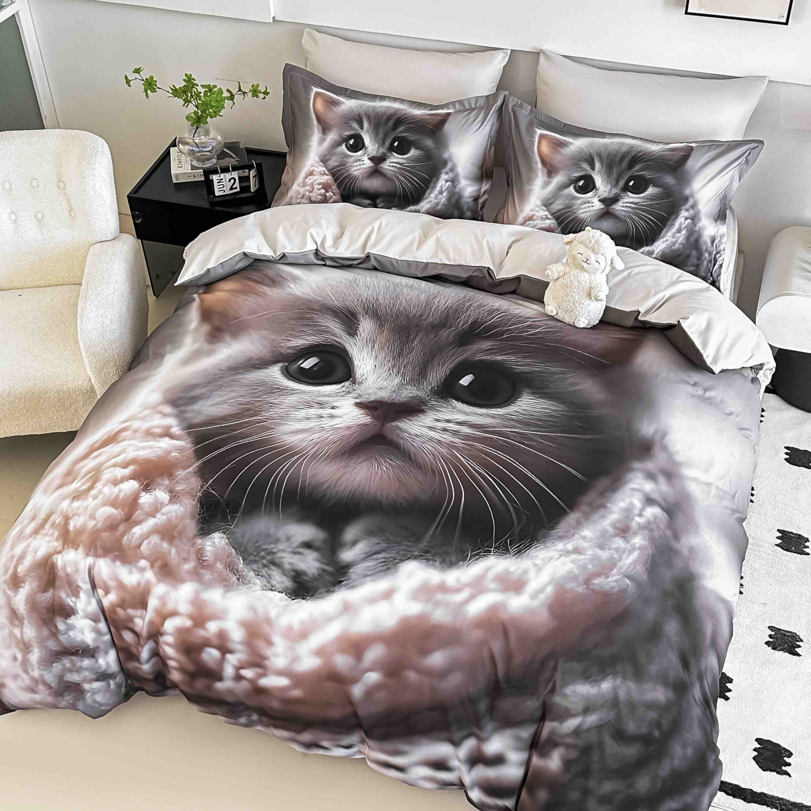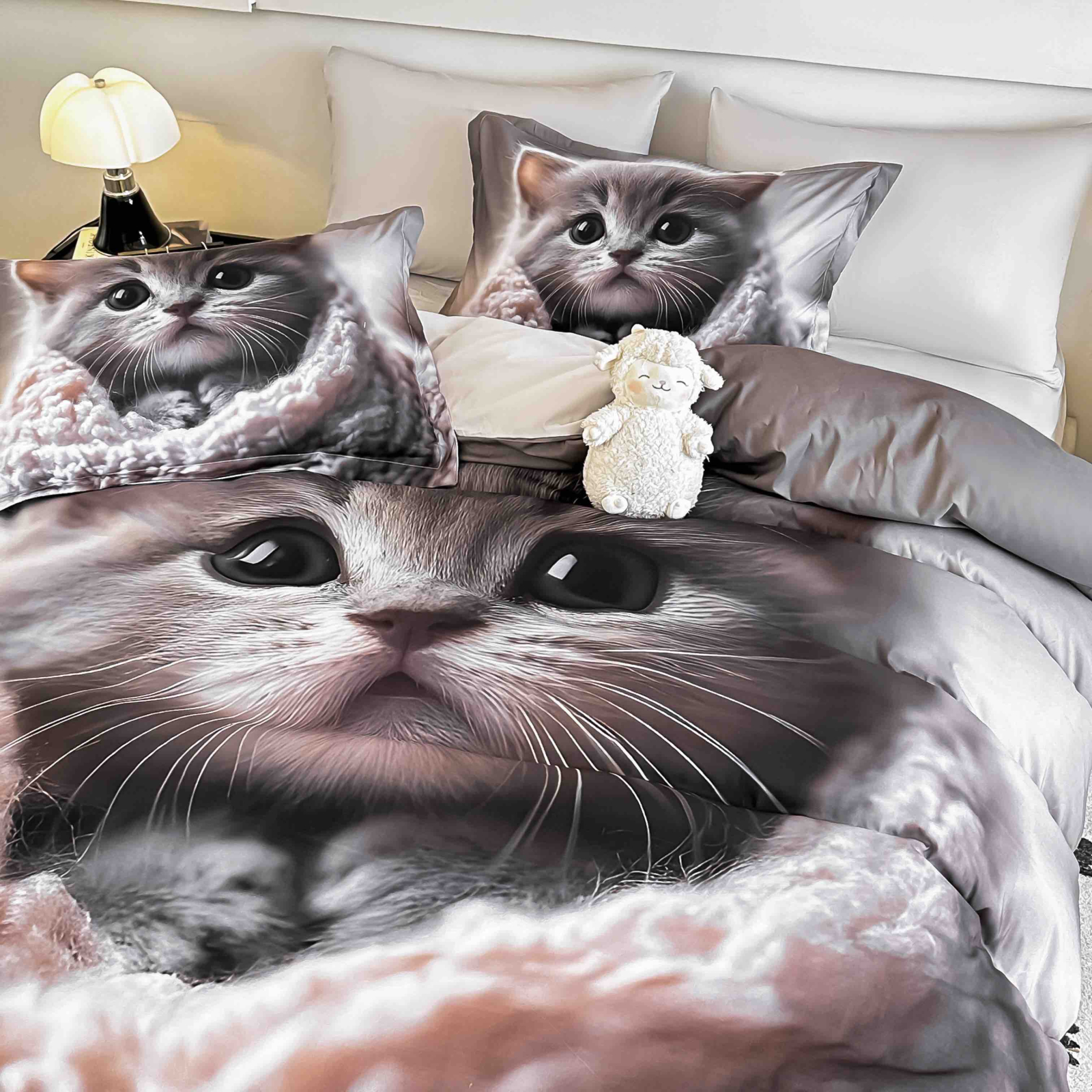 Lenjerie de pat din bumbac finet, formata din 4 piese (cearceaf de pat cu elastic, husa pilota si 2 fete de perna), ideala pentru un dormitor confortabil si elegant. Designul cu o pisicuta pufoasa, in nuante de gri si bej, aduce o atmosfera calda si linistita, perfecta pentru relaxare si somn odihnitor. Materialul din finet este moale, placut la atingere si ofera confort termic atat vara, cat si iarna. Potrivita pentru saltele de 90x200 cm, 100x200 cm, 120x200 cm si 140x200 cm.