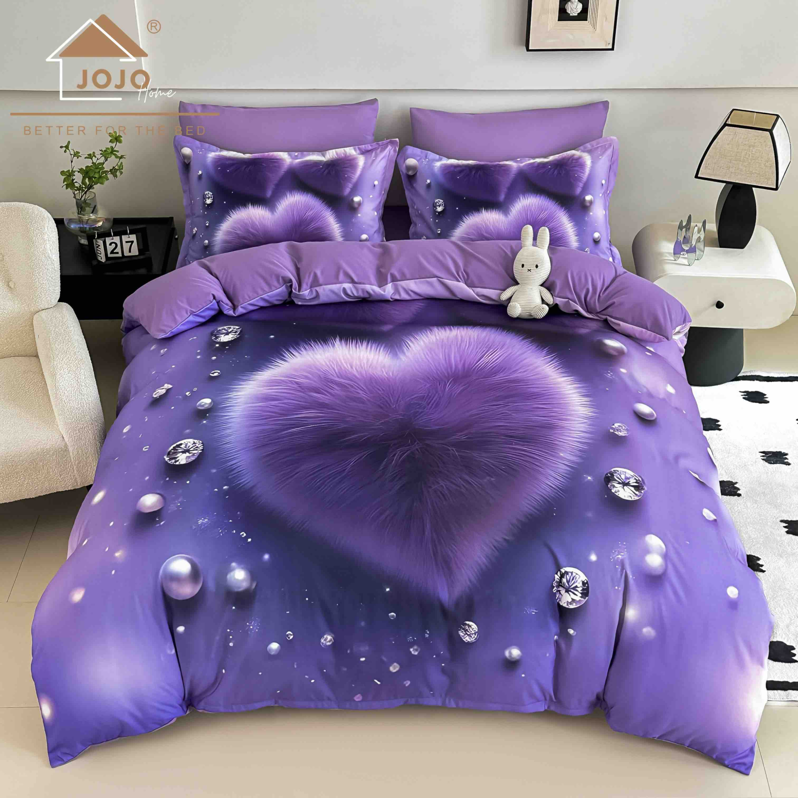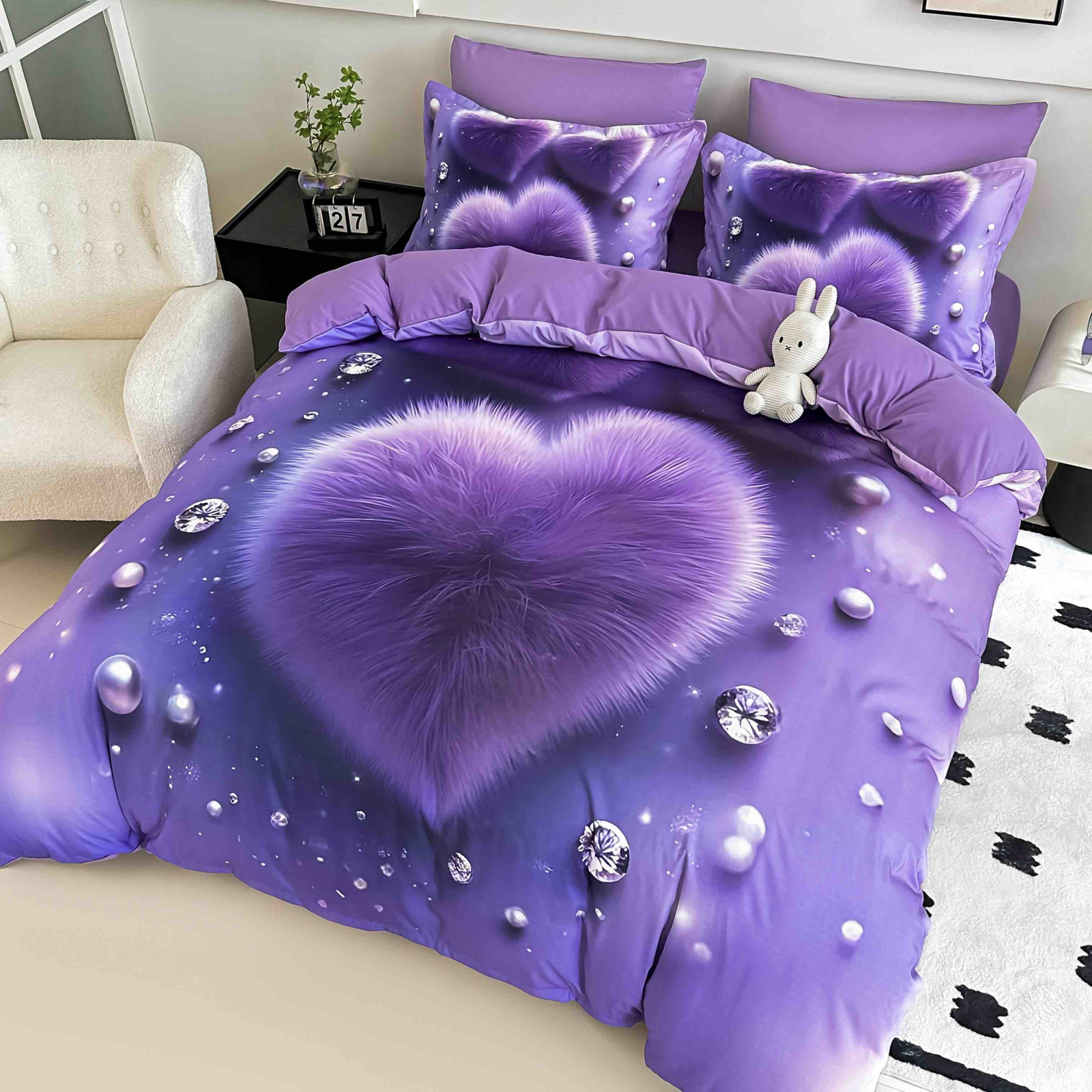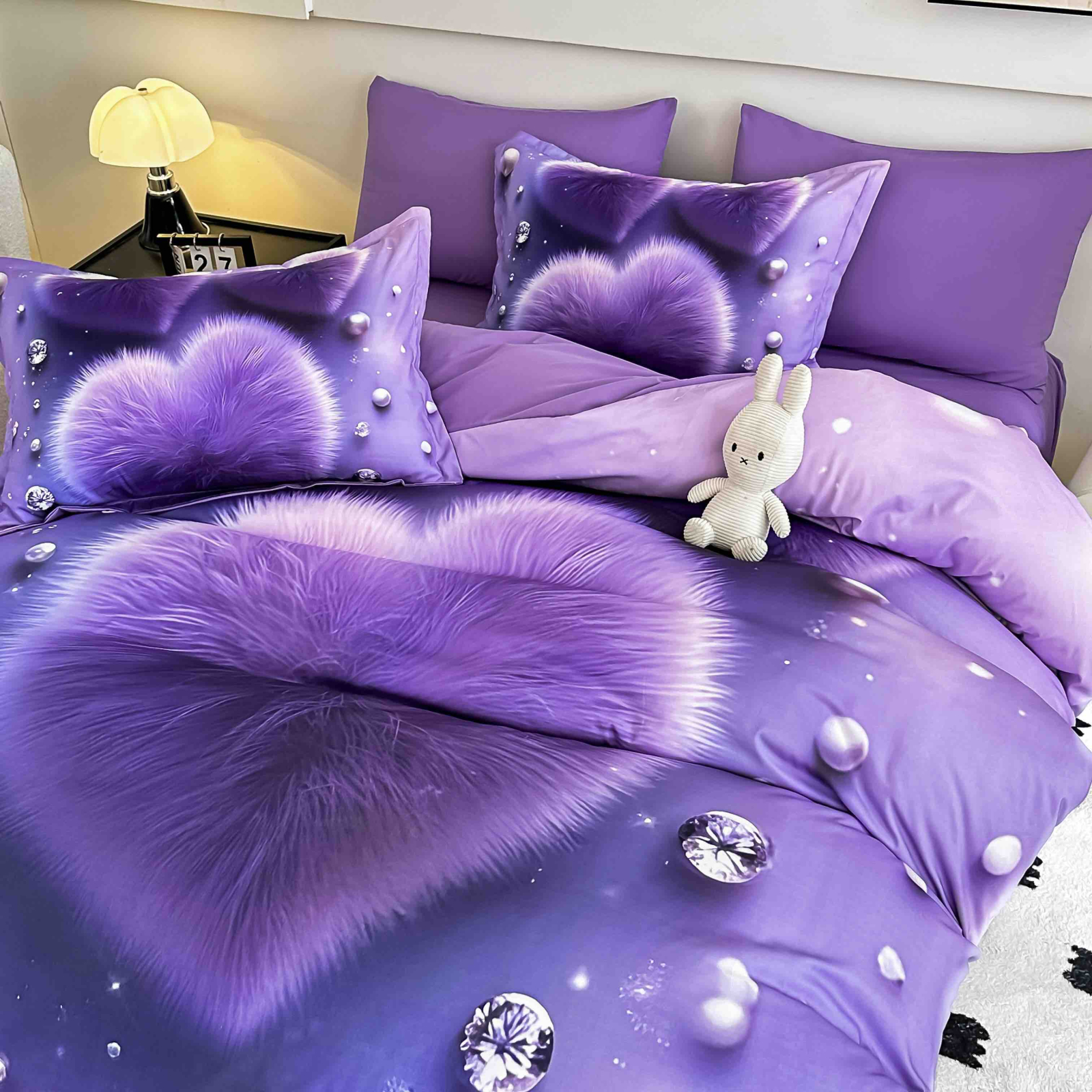 Lenjerie moderna din bumbac finet, formata din 4 piese (cearceaf de pat cu elastic, husa pilota si 2 fete de perna), cu imprimeu 3D in nuante vibrante de mov si lila. Modelul reda o inima pufoasa, inconjurata de perle si cristale, oferind dormitorului un aer romantic si elegant. Materialul moale si catifelat din finet asigura confort maxim si durabilitate in timp, pastrandu-si culorile intense chiar si dupa spalari repetate. Potrivita pentru saltele de 90x200 cm, 100x200 cm, 120x200 cm si 140x200 cm.