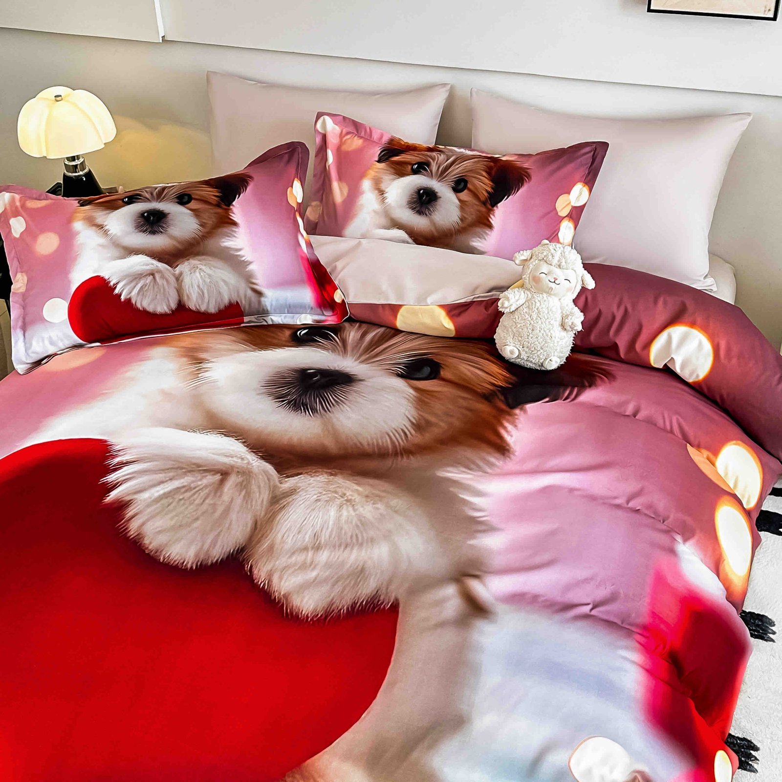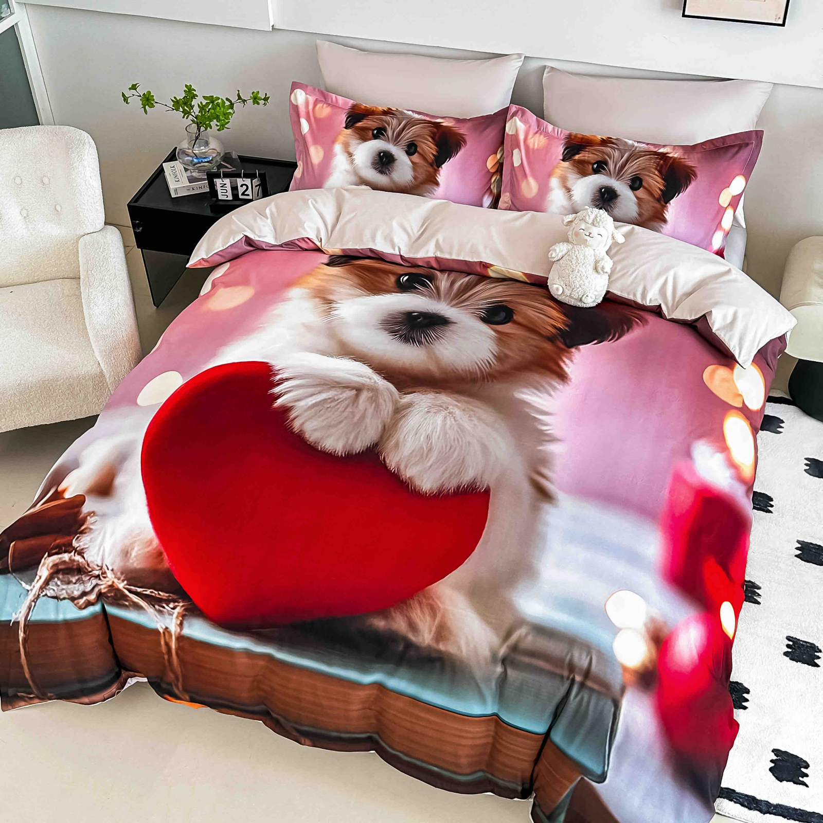 Lenjerie vesela si moderna din bumbac finet, formata din 4 piese (cearceaf de pat cu elastic, husa pilota si 2 fete de perna), cu imprimeu 3D realist ce infatiseaza un catel adorabil tinand o inima rosie. Designul jucaus si culorile calde de roz si rosu creeaza o atmosfera plina de energie pozitiva si afectiune, ideala pentru un dormitor primitor. Materialul din finet ofera moliciune, confort si rezistenta in timp. Potrivita pentru saltele de 90x200 cm, 100x200 cm, 120x200 cm si 140x200 cm.