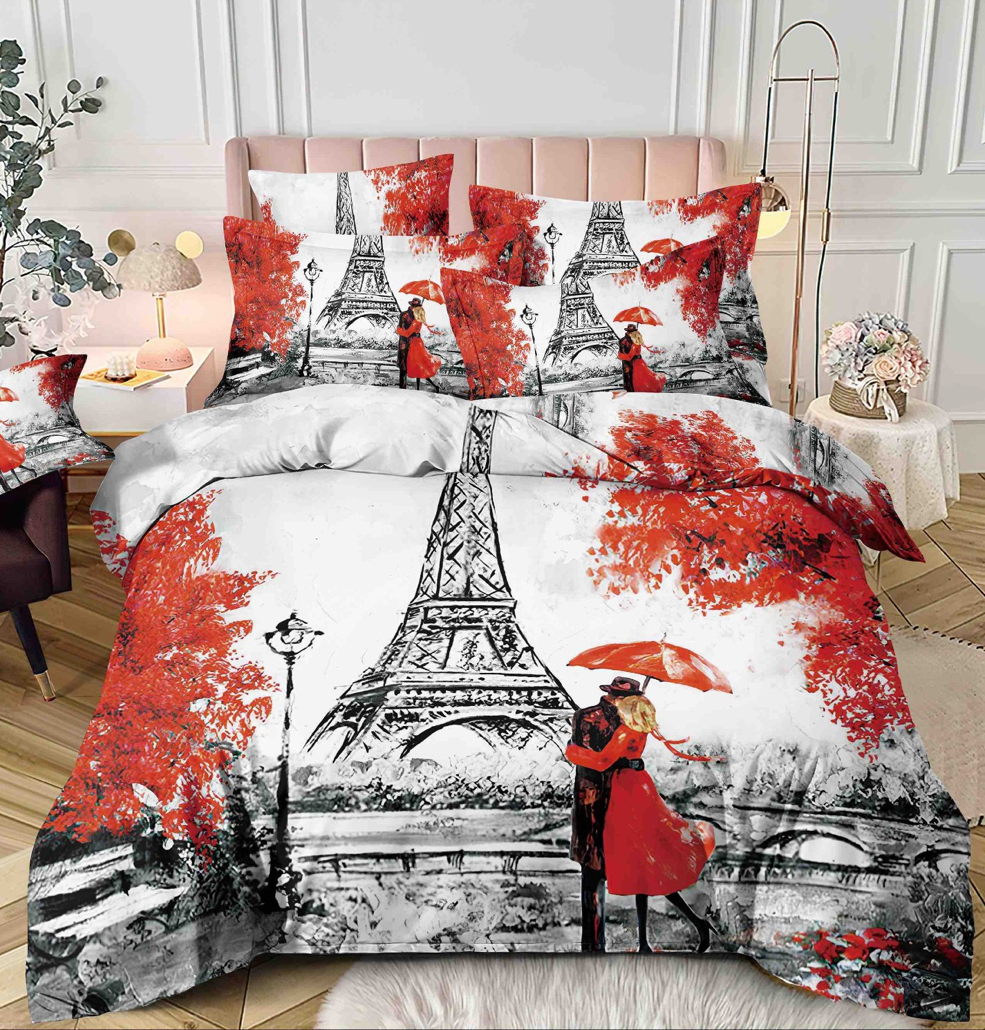 Lenjerie de pat din bumbac finet, compusa din 4 piese (cearceaf de pat cu elastic, husa pilota si 2 fete de perna), ideala pentru cei care iubesc romantismul si rafinamentul stilului parizian. Imprimeul artistic cu Turnul Eiffel si un cuplu sub umbrela rosie reda perfect atmosfera de toamna in Paris, oferind dormitorului o nota eleganta si visatoare. Tesatura din finet este moale, placuta la atingere si asigura confort termic optim in orice sezon. Potrivita pentru saltele de 90x200 cm, 100x200 cm, 120x200 cm si 140x200 cm.