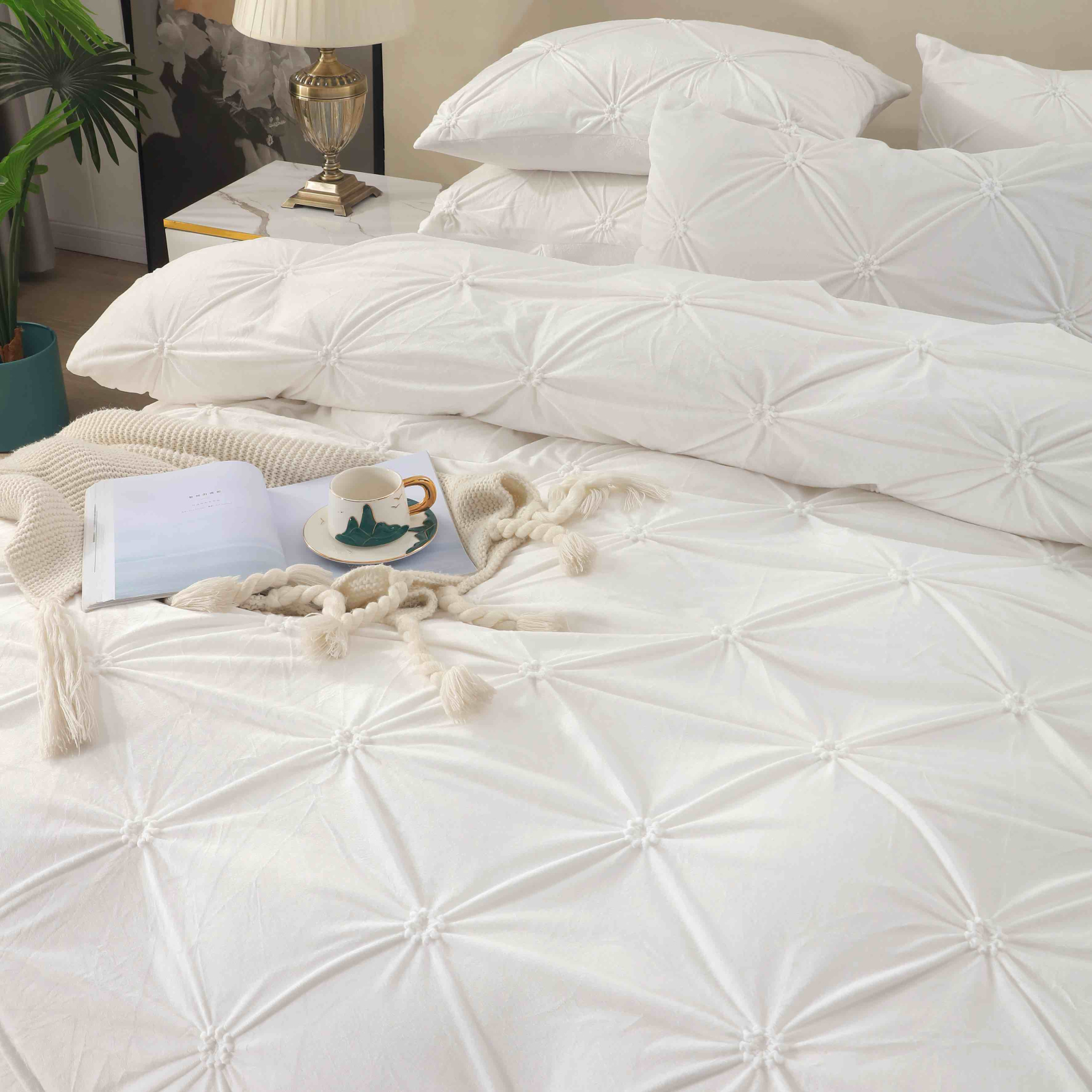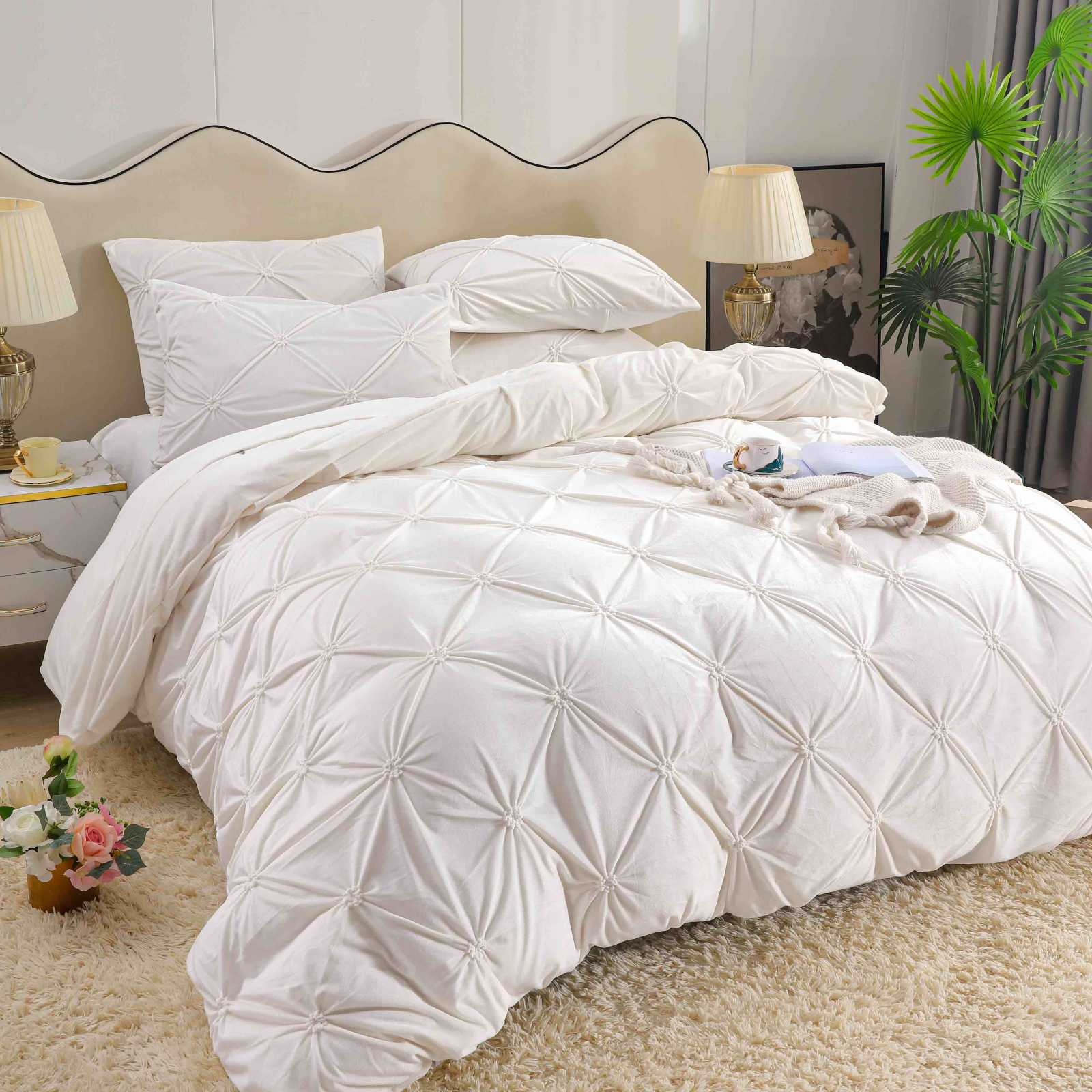 Lenjerie de pat dublu din catifea cu pliuri,cearceaf cu elastic,4 piese,alba- A1390 + CADOU