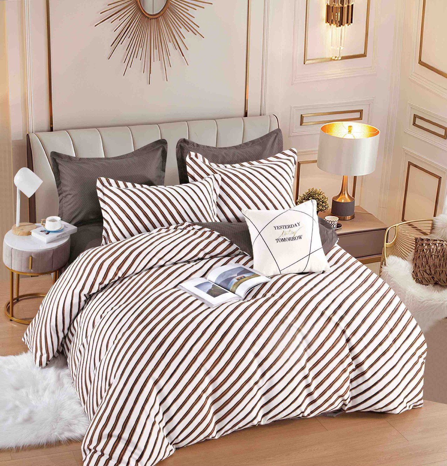 Lenjerie de pat din finet de culoare alba/maro, imprimeu cu dungi, compusa din 6 piese(cearceaf de pat cu elastic,husa pilota si 4 fete de perna) menita sa satisfaca si cele mai pretentioase gusturi,perfecta pentru saltele cu dimensiunea de
