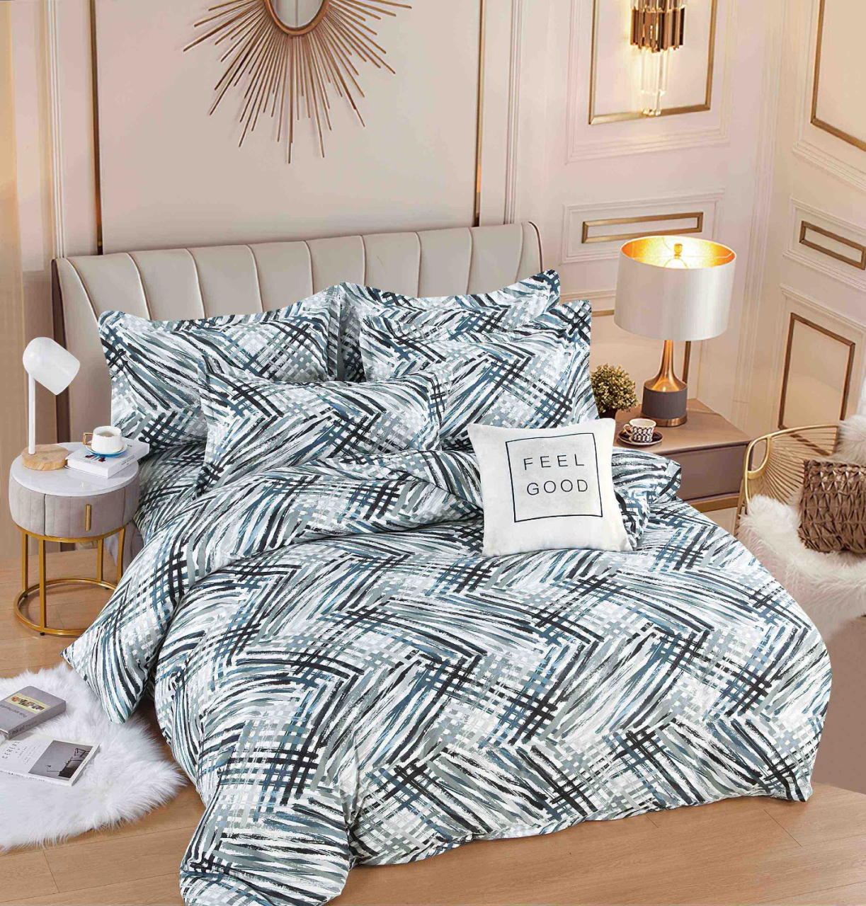 Lenjerie de pat din finet de culoare alba/gri, imprimeu cu dungi, compusa din 6 piese(cearceaf de pat cu elastic,husa pilota si 4 fete de perna) menita sa satisfaca si cele mai pretentioase gusturi,perfecta pentru saltele cu dimensiunea de 140x200cm,160x200cm si 180x200cm.