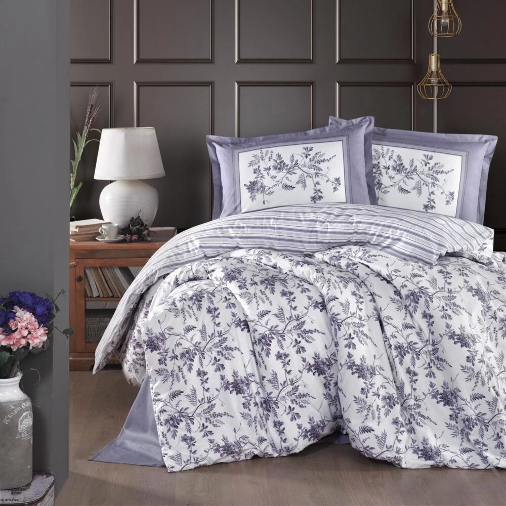 Lenjerie pat dublu,bumbac ranforce,4 piese,alba/lila cu flori,MonteraV2-A1294 + CADOU