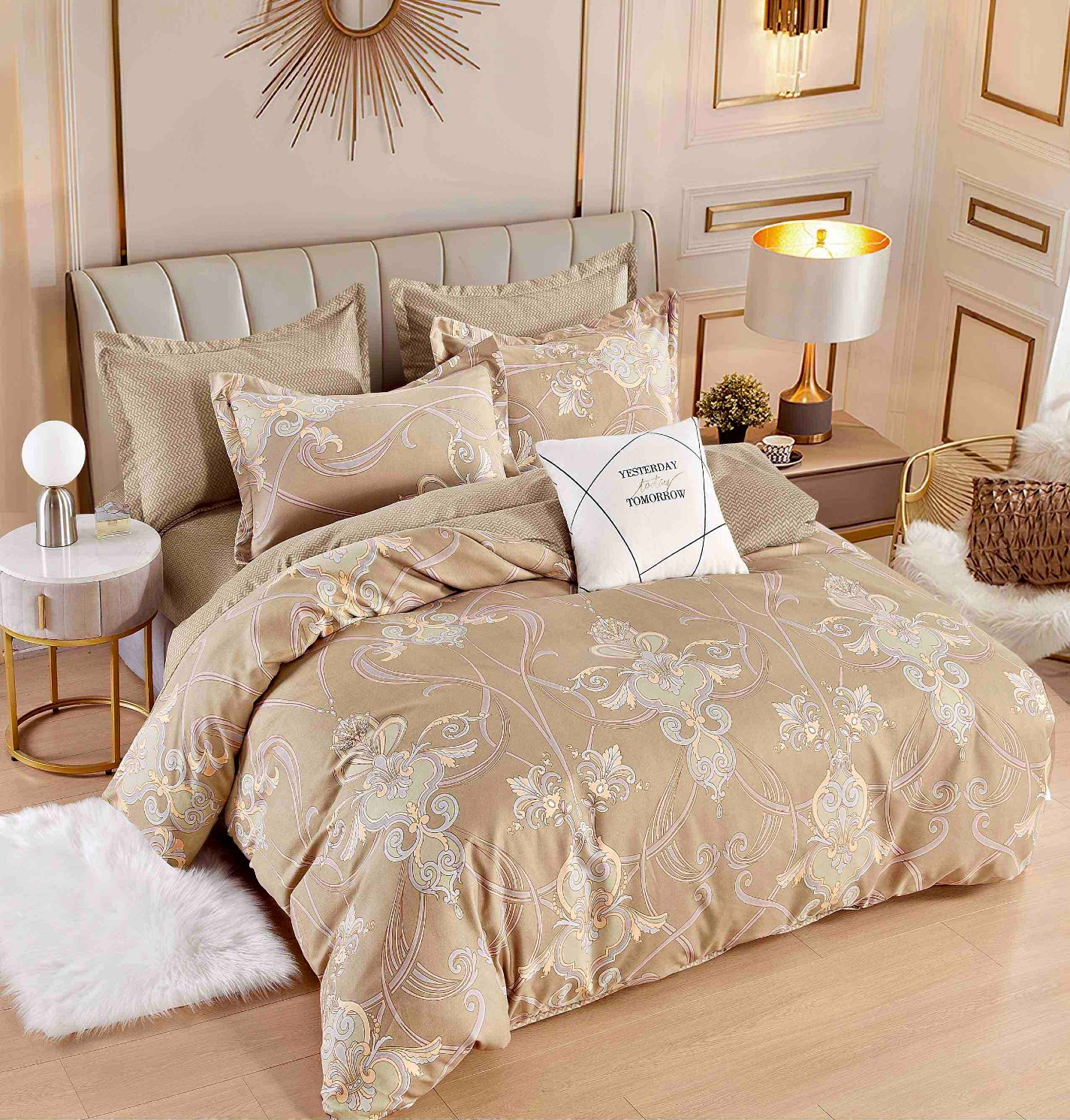 Lenjerie de pat din finet de culoare bej cu motiv floral,compusa din 6 piese(cearceaf de pat cu elastic,husa pilota si 4 fete de perna) menita sa satisfaca si cele mai pretentioase gusturi,perfecta pentru saltele cu dimensiunea de