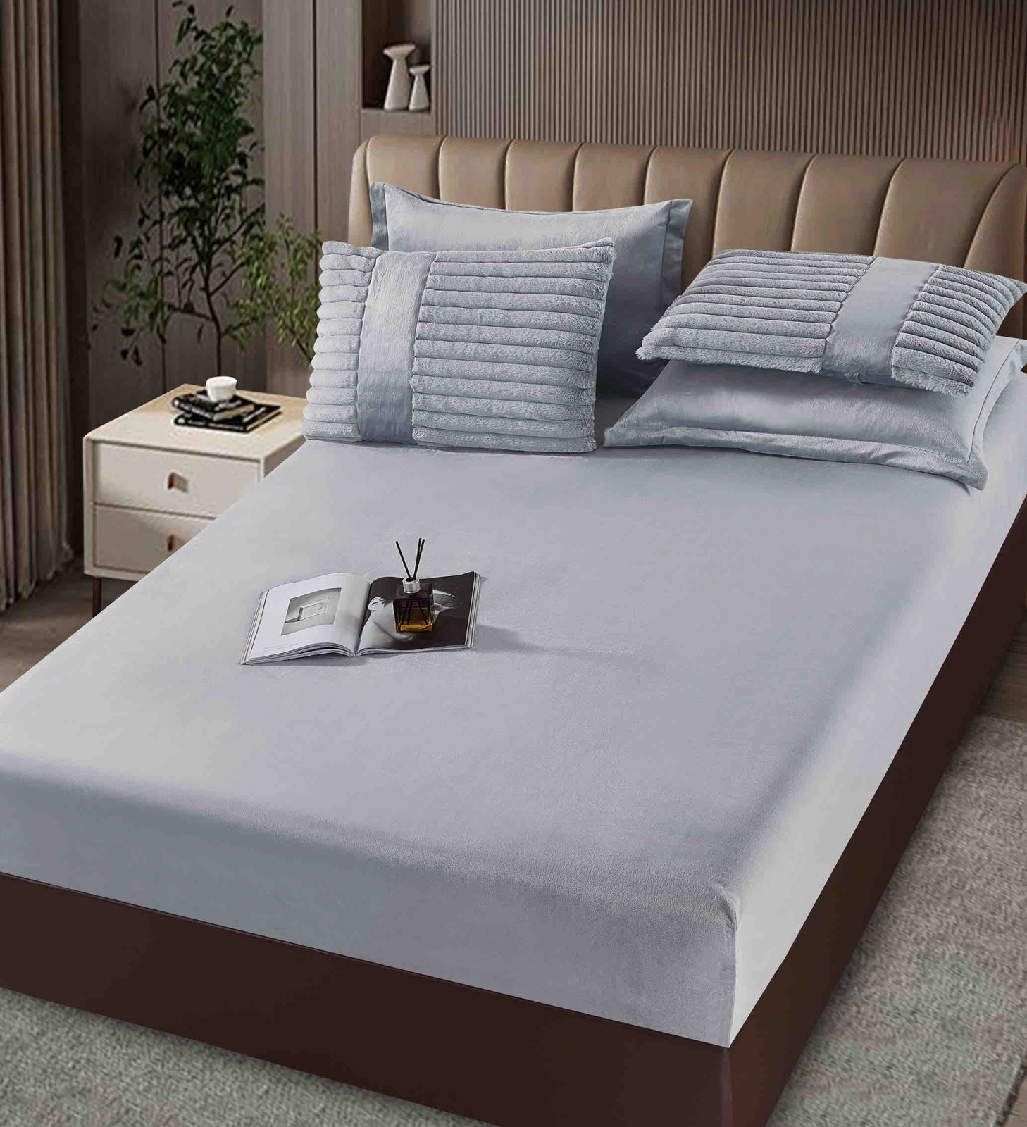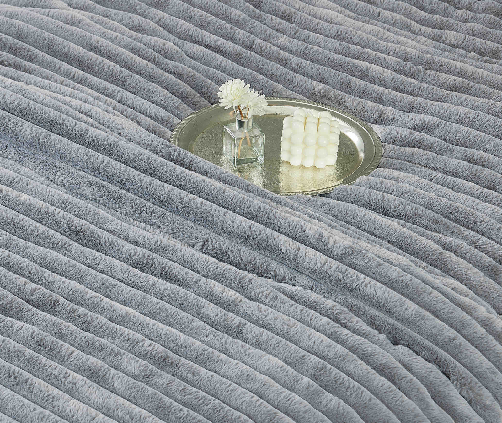 Lenjerie pat cu pilota inclusa din catifea si blanita artificiala de iepure,cearceaf cu elastic,gri deschis- A1218 + CADOU