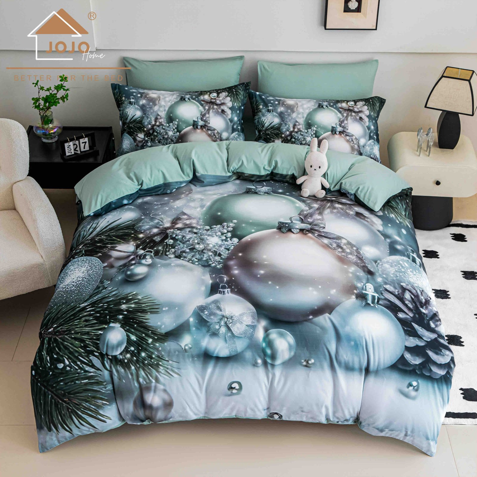 Lenjerie de pat Craciun, imprimeu 5D globuri argintii, turcoaz, pat dublu, 6 piese (cearceaf cu elastic, husa pilota, 4 fete de perna), material finet moale, potrivita pentru saltele 140x200cm, 160x200cm si 180x200cm
