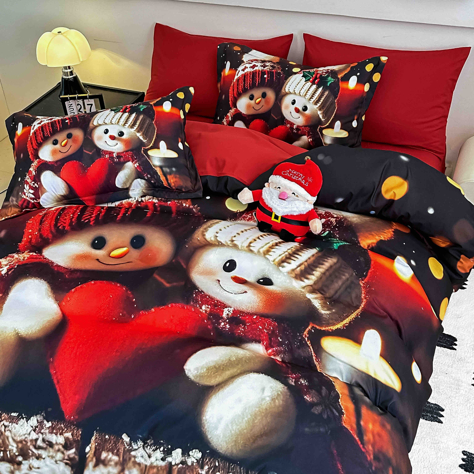 Lenjerie de pat Craciun, imprimeu 5D Omul de zapada cu inima rosie, fundal luminat, pat dublu, 6 piese (cearceaf cu elastic, husa pilota, 4 fete de perna), material finet moale, potrivita pentru saltele 140x200cm, 160x200cm si 180x200cm