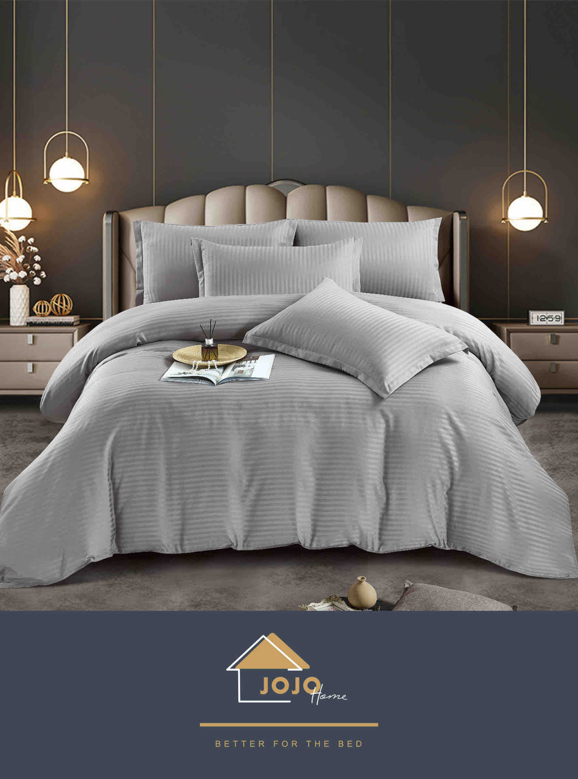 Lenjeria de pat damasc satinat cu elastic,gri deschis,potrivita pentru saltele cu dimeniunea 160x200cm si pentru cele cu dimensiunea 180x200cm marca Jojo Home este realizata din 80% polyester si 20% bumbac, tip tesatura damasc striat (cu dungile inguste 1cm) fiind considerat cel mai potrivit pentru hoteluri si pensiuni, cu utilizare frecventa.