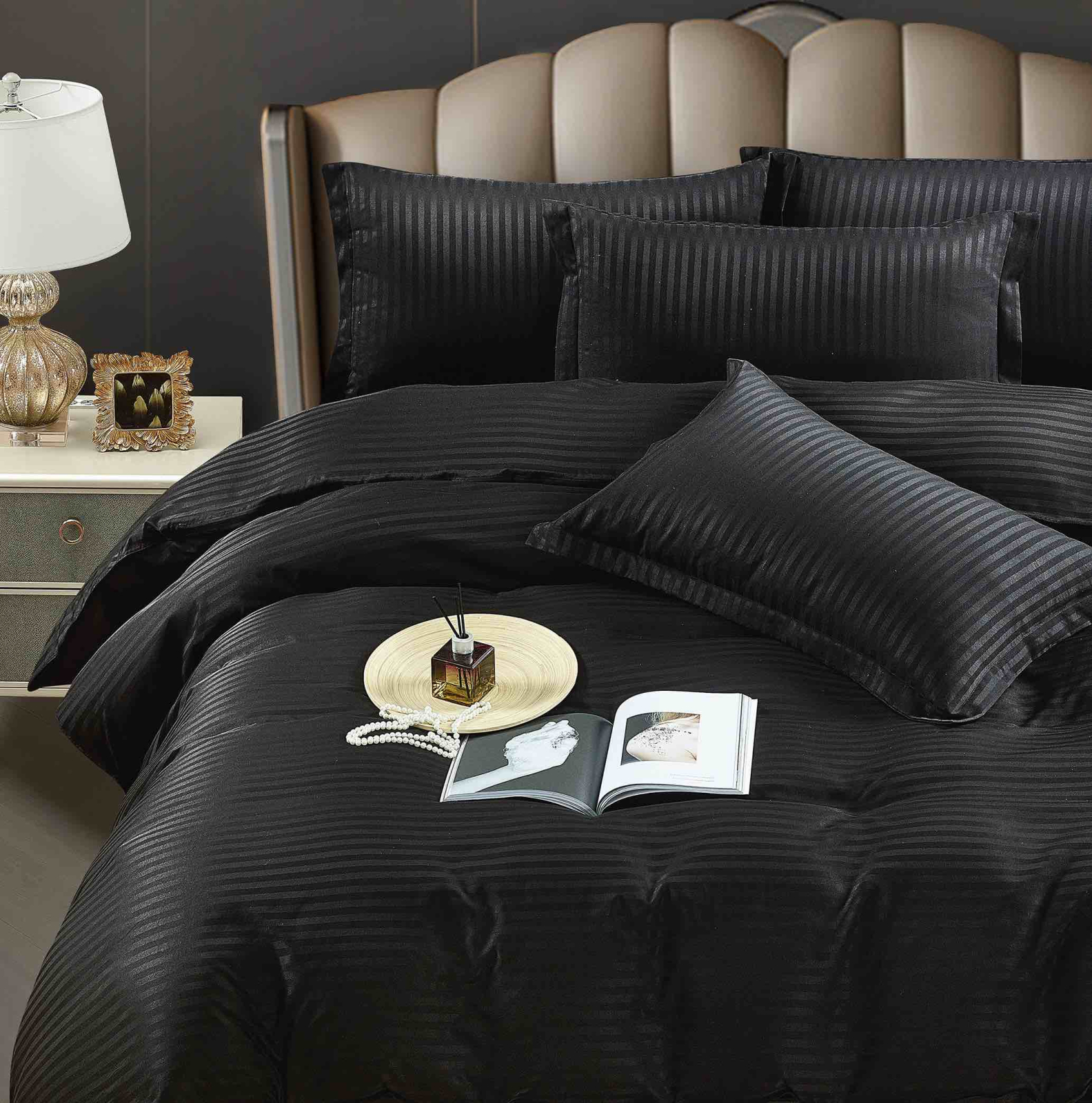 Lenjeria de pat damasc satinat cu elastic,neagra,potrivita pentru saltele cu dimeniunea 160x200cm si pentru cele cu dimensiunea 180x200cm marca Jojo Home este realizata din 80% polyester si 20% bumbac, tip tesatura damasc striat (cu dungile inguste 1cm) fiind considerat cel mai potrivit pentru hoteluri si pensiuni, cu utilizare frecventa.