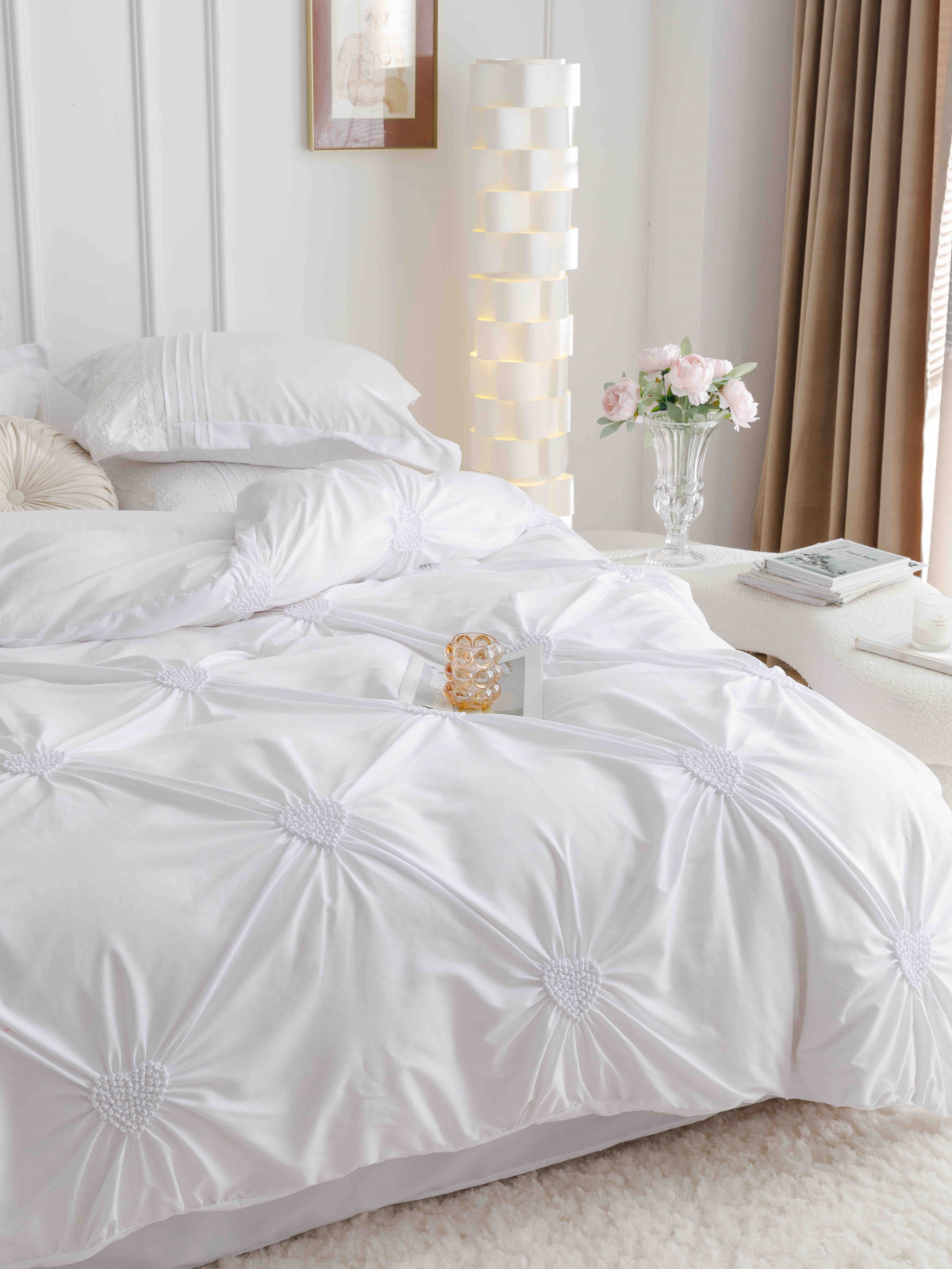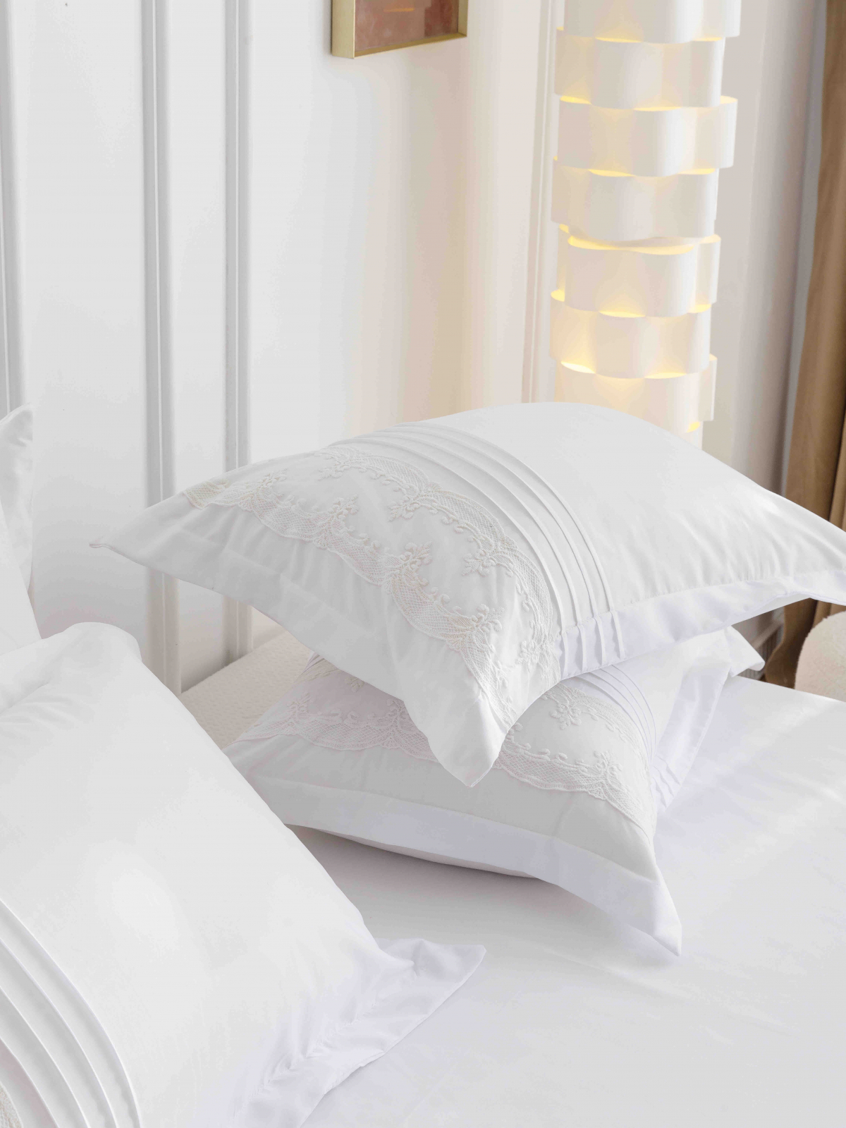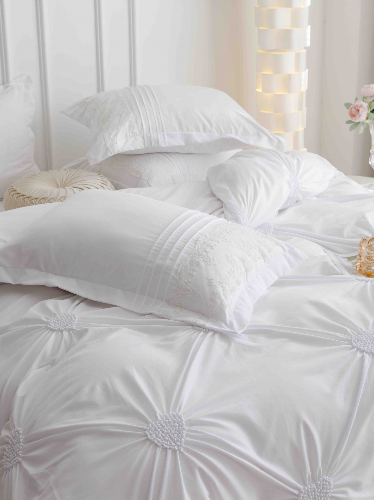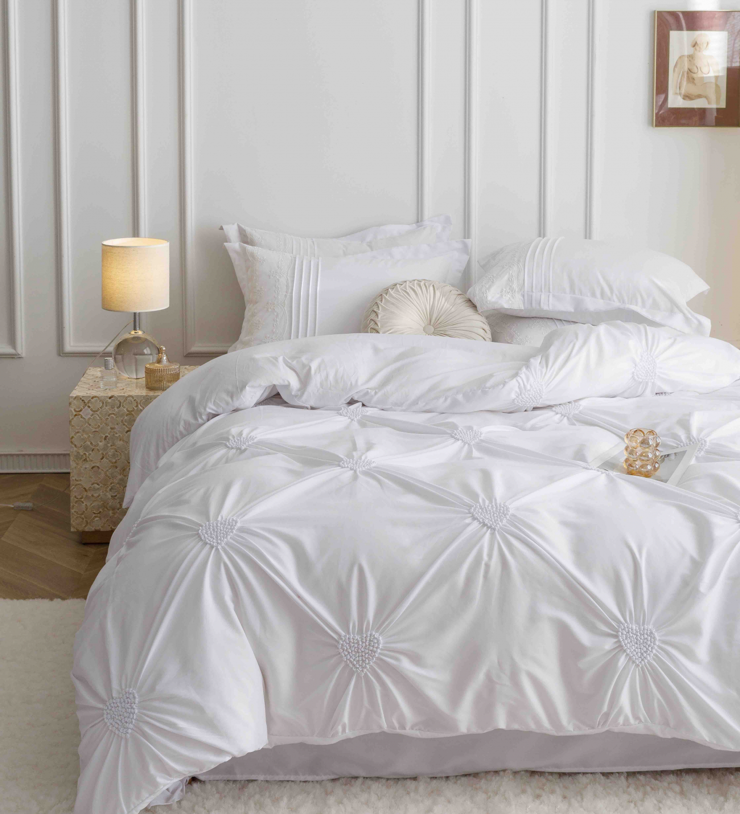 Lenjerie de pat din finet cu pliuri si inimi brodate,de culoare alba pentru pat dublu,compusa din 6 piese(cearceaf de pat fara elastic,husa pilota si 4 fete de perna) menita sa satisfaca si cele mai pretentioase gusturi,perfecta pentru saltele cu dimensiunea de