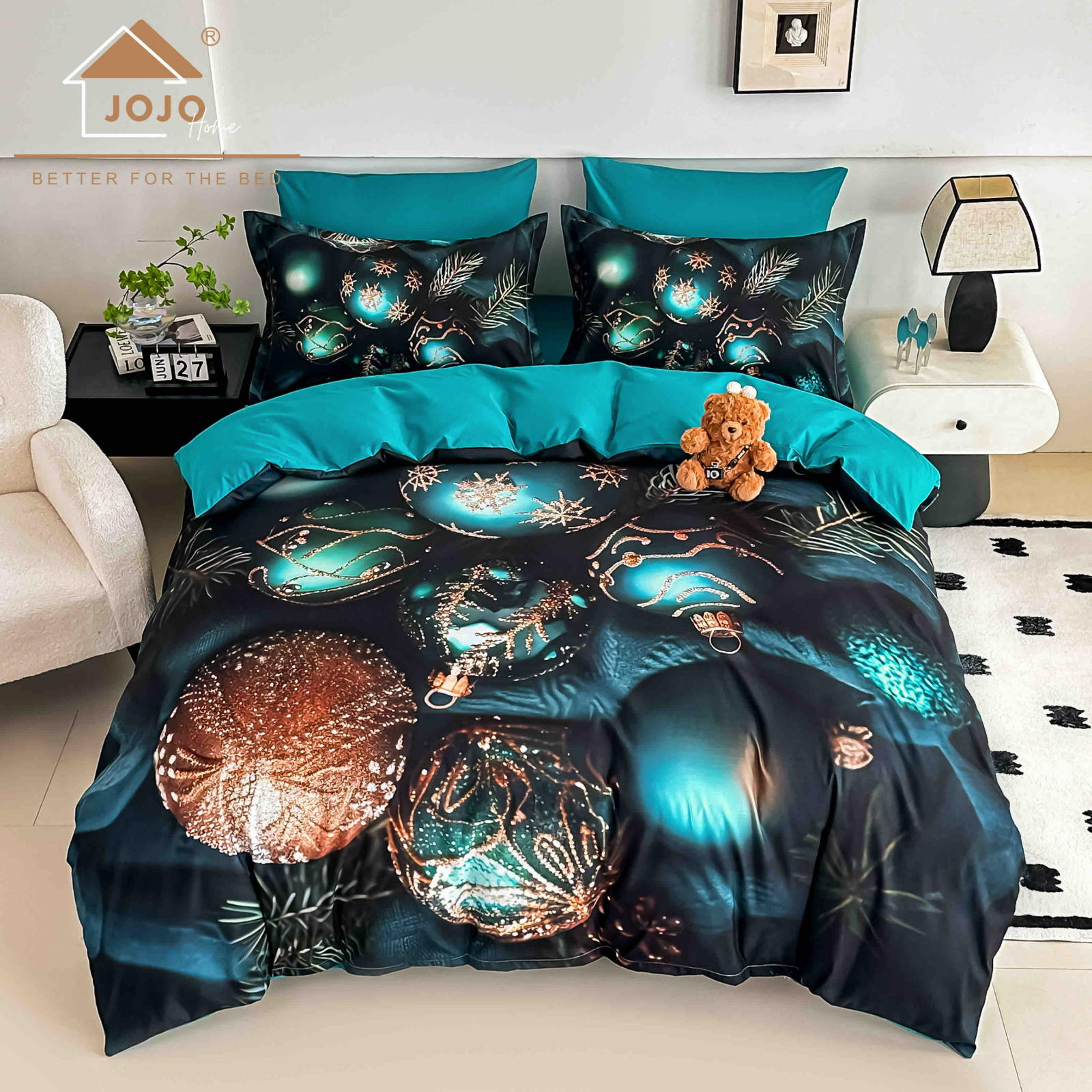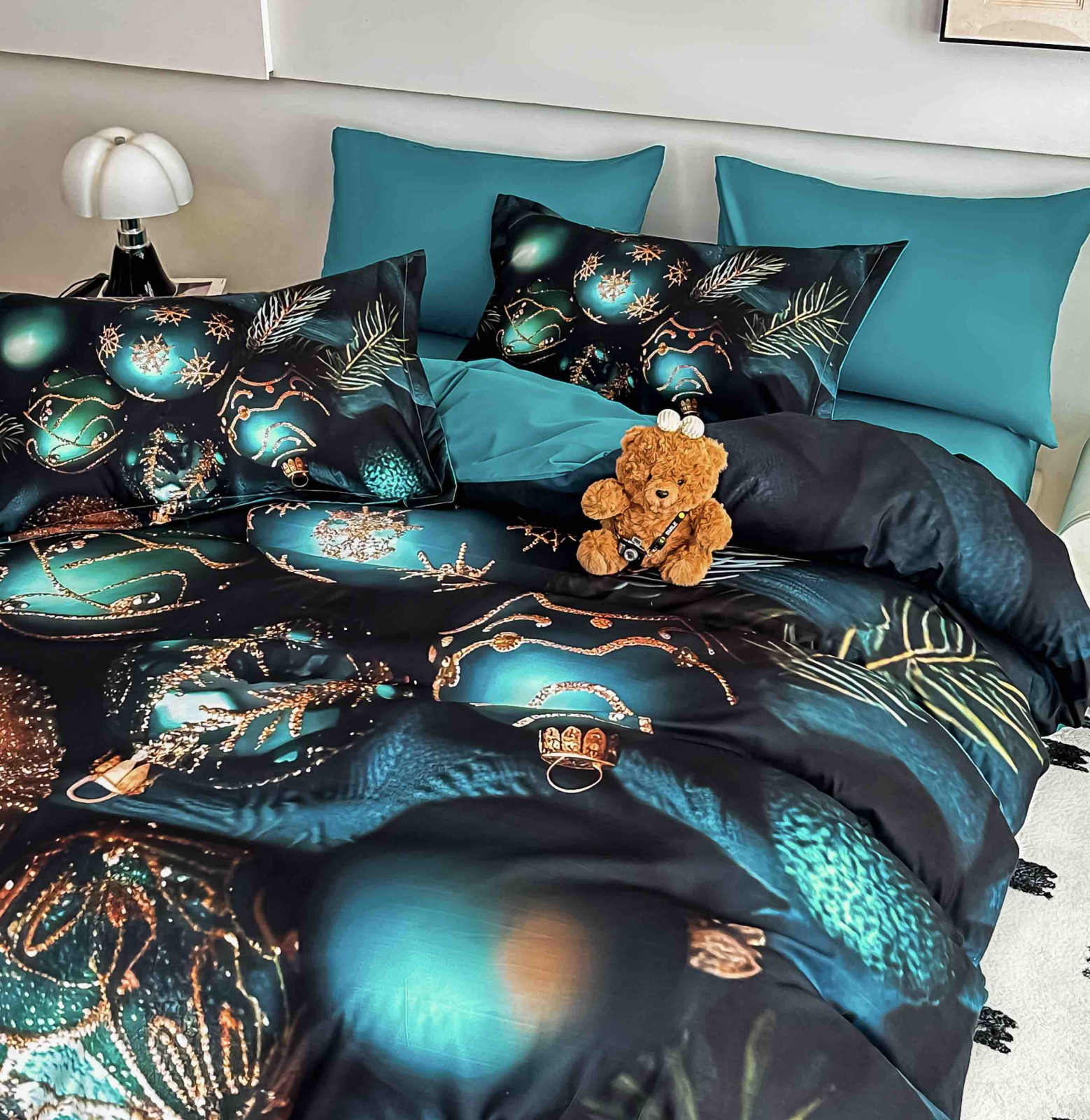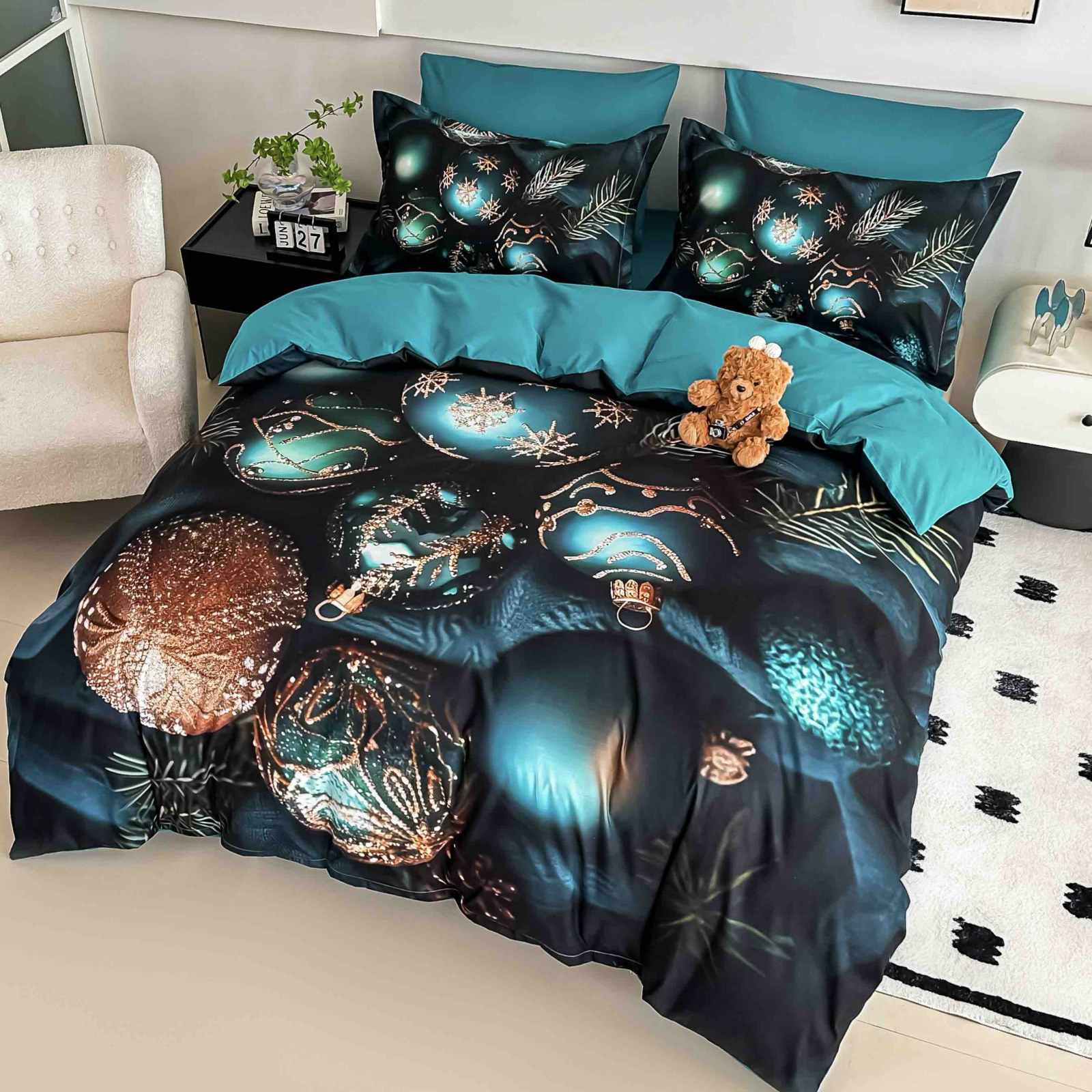 Lenjeria de Craciun 5D Jojo Home cu imprimeu de globuri turcoaz și aurii adaugă o notă de rafinament și strălucire dormitorului tău, oferind un confort desăvârșit.