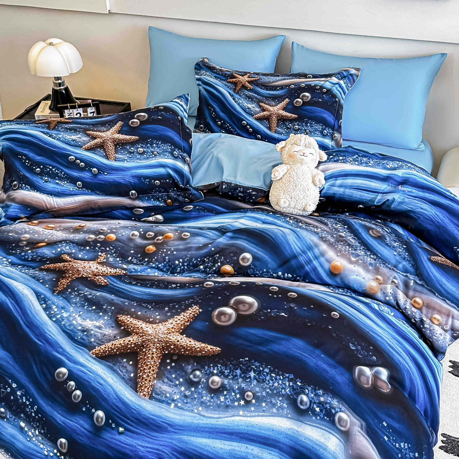 Lenjerie de pat din bumbac finet, compusa din 4 piese (cearceaf de pat cu elastic, husa pilota si 2 fete de perna), ideala pentru un dormitor cu aer fresh si relaxant. Imprimeul marin cu valuri albastre, stele de mare si bule fine aduce o atmosfera de vacanta si prospetime, transformand dormitorul intr-un spatiu de liniste si confort. Tesatura din finet este fina, moale si placuta la atingere, oferind un somn odihnitor si confortabil indiferent de anotimp. Potrivita pentru saltele de 90x200 cm, 100x200 cm, 120x200 cm si 140x200 cm.