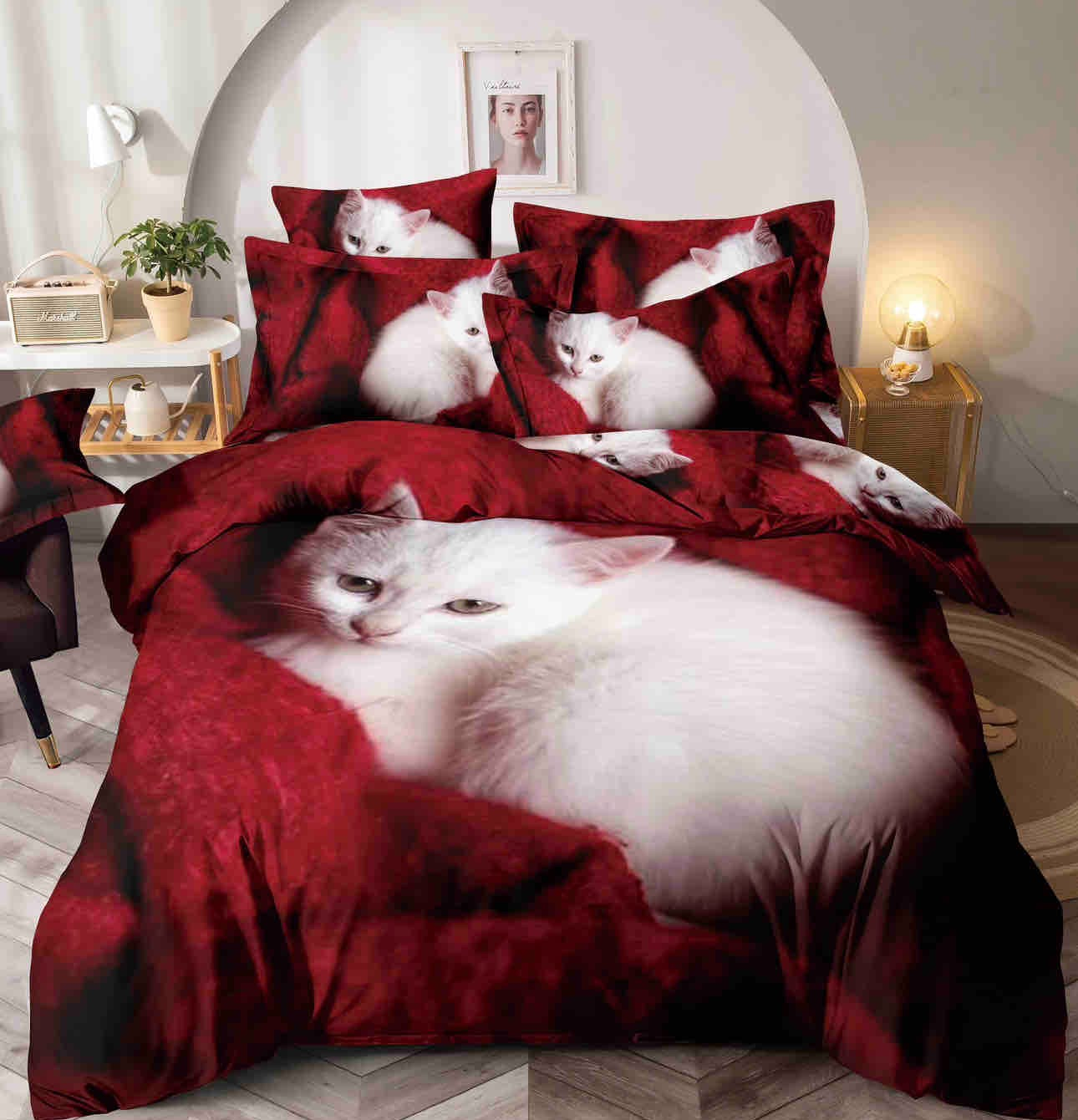 Lenjerie de pat din bumbac finet, compusa din 4 piese (cearceaf de pat cu elastic, husa pilota si 2 fete de perna), conceputa pentru a aduce o nota calda si relaxanta in dormitorul tau. Imprimeul realist cu o pisica alba pe fundal rosu intens creeaza o atmosfera placuta si reconfortanta, perfecta pentru iubitorii de animale si pentru un decor modern. Materialul din finet este moale, placut la atingere si pastreaza caldura fara a provoca disconfort. Potrivita pentru saltele cu dimensiunea de 90x200 cm, 100x200 cm, 120x200 cm si 140x200 cm.