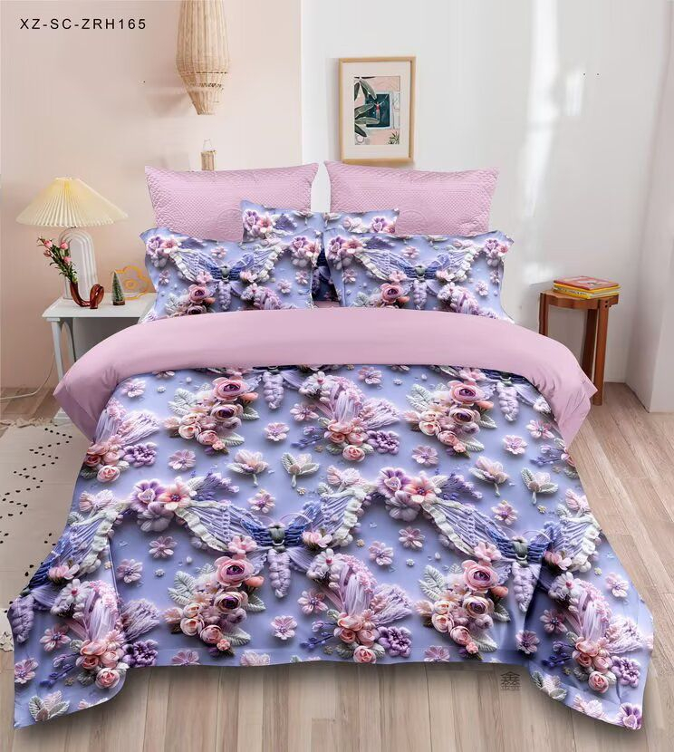 Lenjerie de pat 5D, imprimeu floral mov-lila cu trandafiri si dantela, pat dublu, 6 piese (cearceaf normal, husa pilota, 4 fete de perna) – Talo