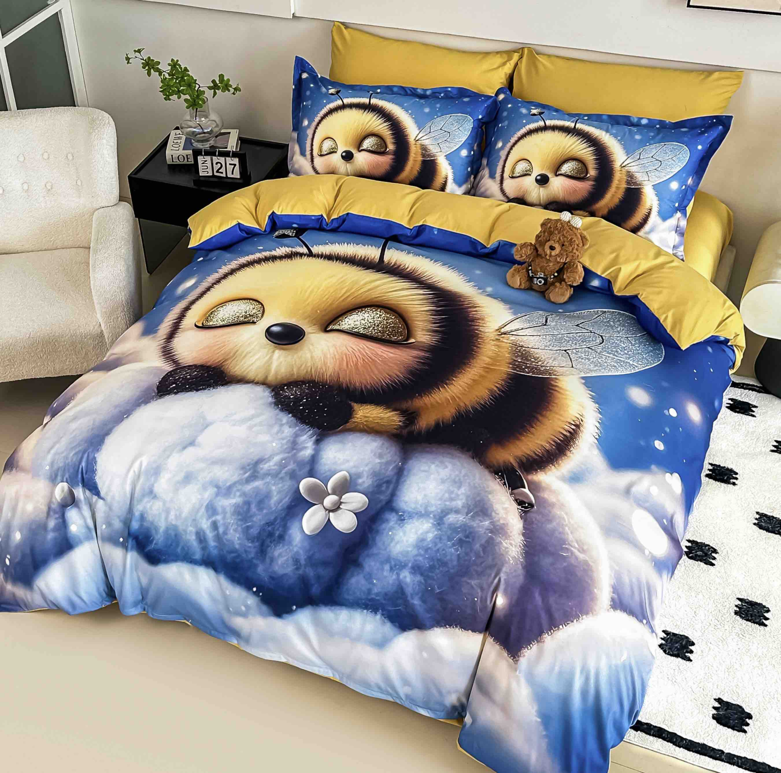 Lenjeria 5D Jojo Home cu imprimeu de albina adormita aduce o nota de caldura si veselie oricarui dormitor, oferind confort si un aspect spectaculos.