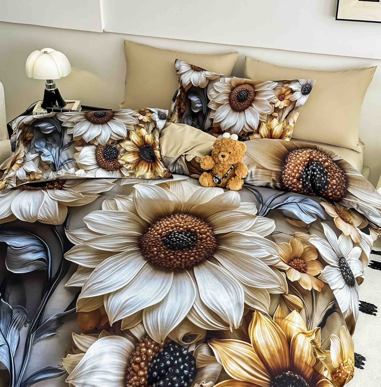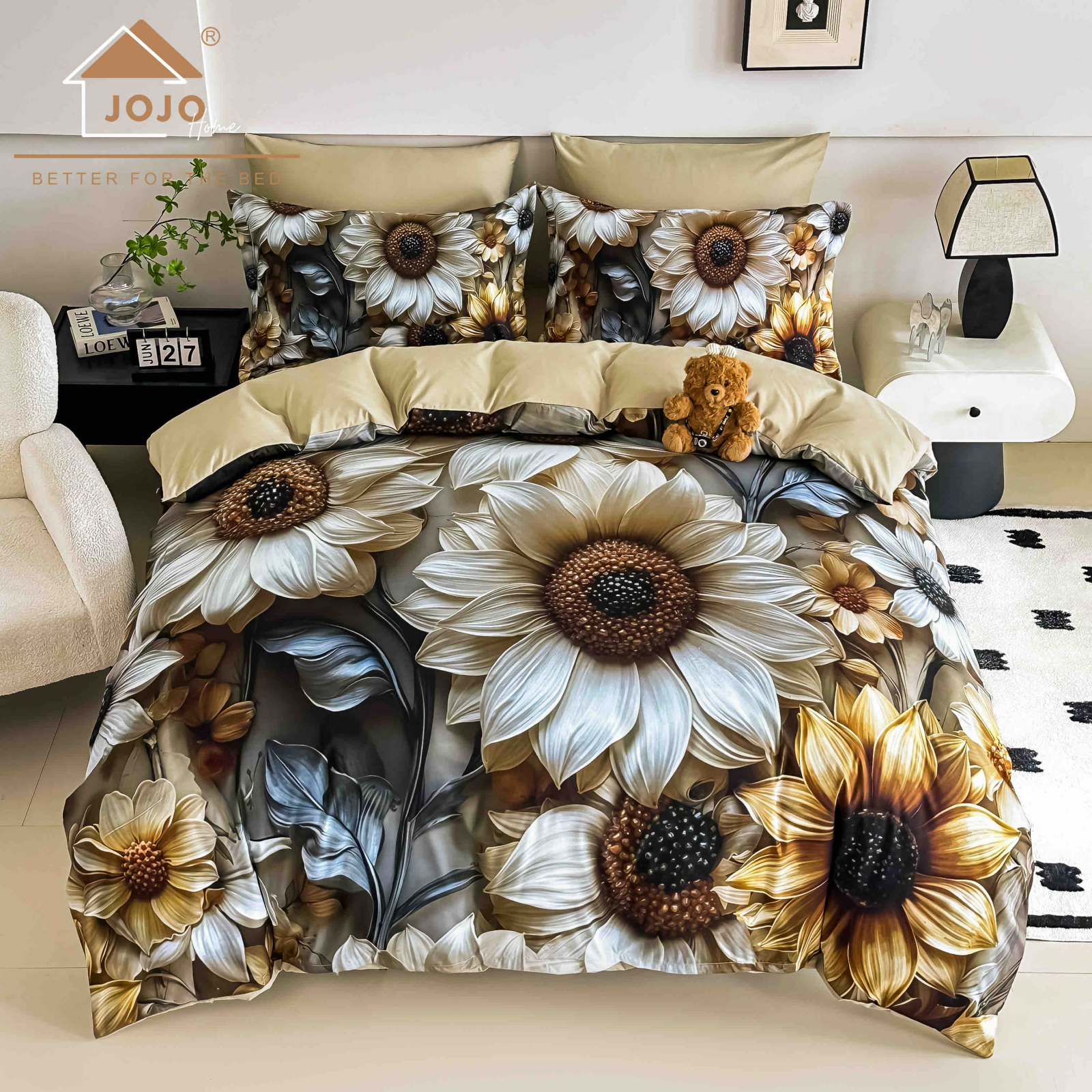 Transforma dormitorul intr-un spatiu elegant si relaxant cu aceasta lenjerie de pat 5D din finet moale, decorata cu flori mari in nuante de bej si auriu, accentuate de tonuri calde si detalii realiste. Designul floral confera un aer sofisticat, ideal pentru interioare moderne sau clasice.