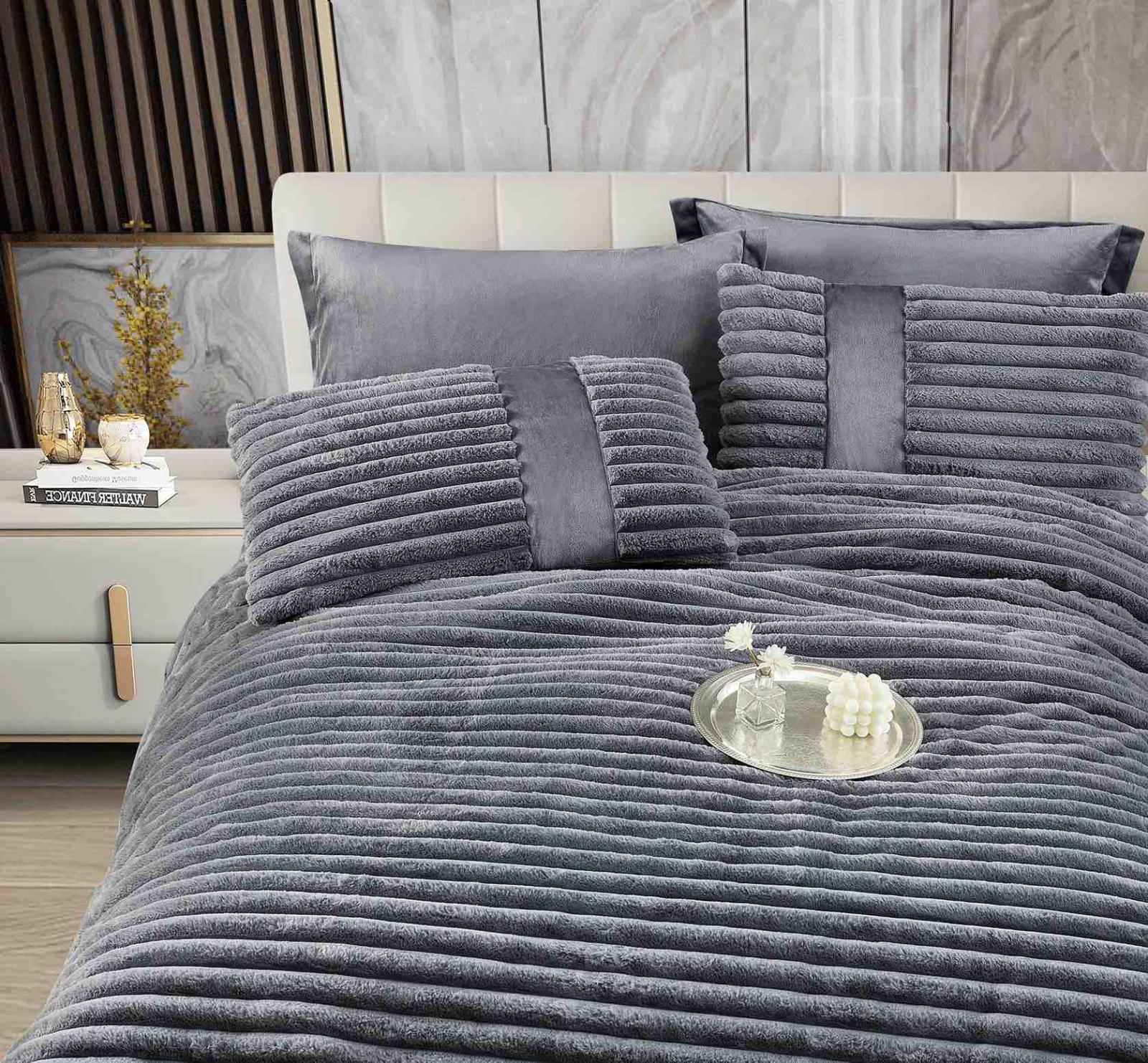 Transformă-ți dormitorul într-un spațiu plin de stil și căldură cu lenjeria de pat din catifea Jojo Home, în nuanța rafinată de gri inchis – disponibilă acum pe casa-decor.ro.