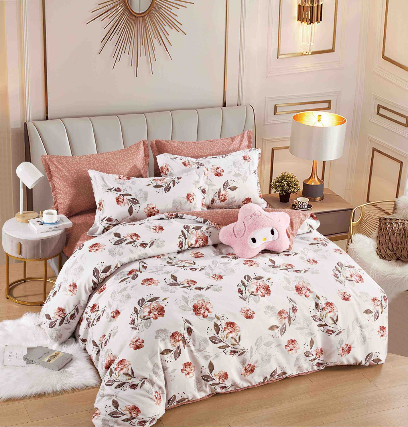 Lenjerie de pat din finet de culoare crem portocalie, imprimeu cu flori, compusa din 6 piese(cearceaf de pat cu elastic,husa pilota si 4 fete de perna) menita sa satisfaca si cele mai pretentioase gusturi,perfecta pentru saltele cu dimensiunea de 140x200cm,160x200cm si 180x200cm.