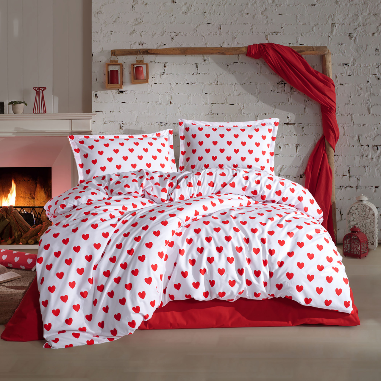 Lenjerie de pat din bumbac ranforce alba/rosie, imprimeu cu inimioare(AmorV2) pentru pat dublu,formata din 4 piese(cearceaf de pat fara elastic,husa pilota si 2 fete de perna),eleganta,simpla,perfecta pentru saltele cu dimensiunea de