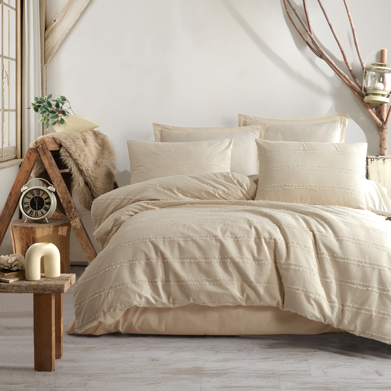 Lenjerie de pat din bumbac ranforce bej deschis(Avola V1) pentru pat dublu,formata din 4 piese(cearceaf de pat fara elastic,husa pilota si 2 fete de perna),eleganta,simpla,perfecta pentru saltele cu dimensiunea de