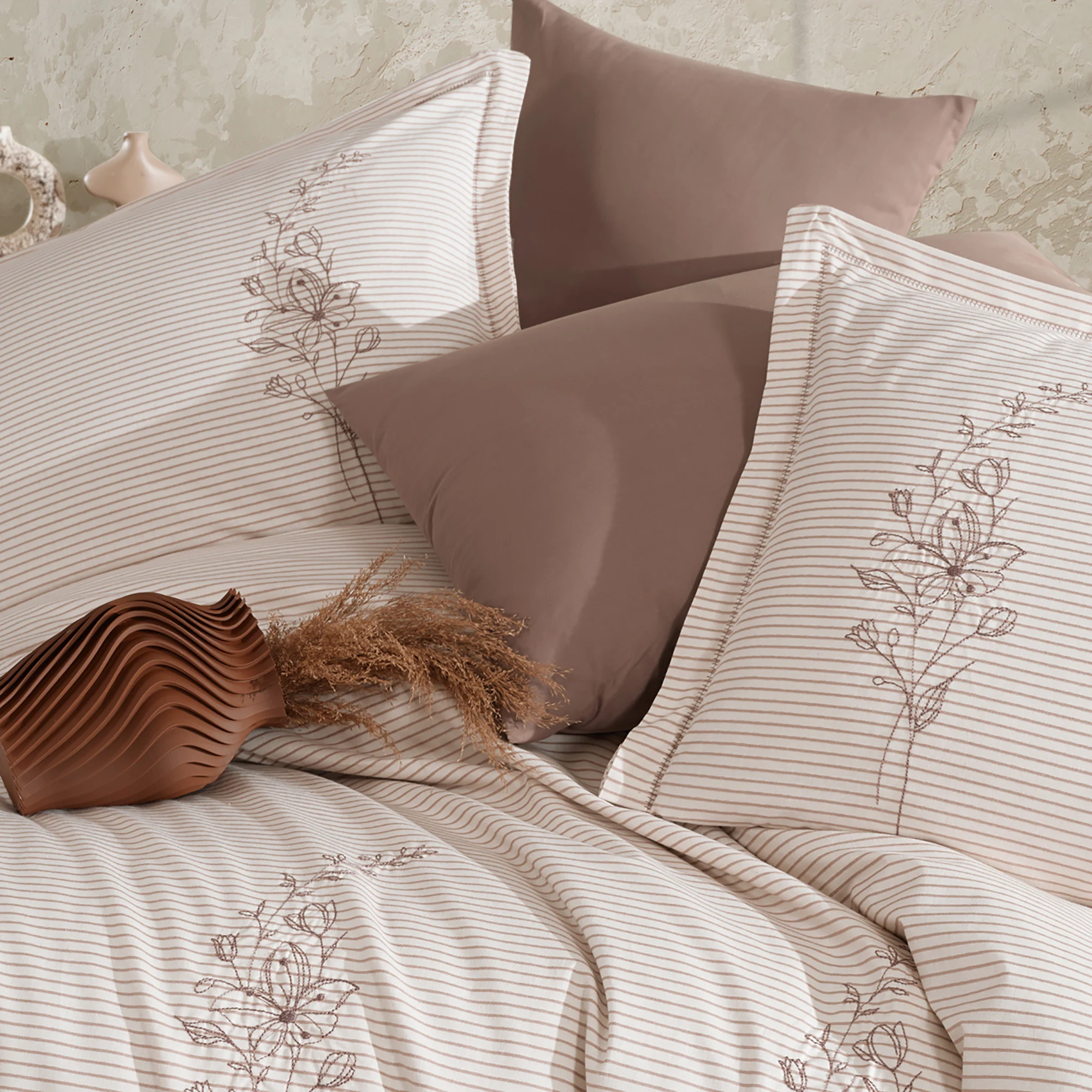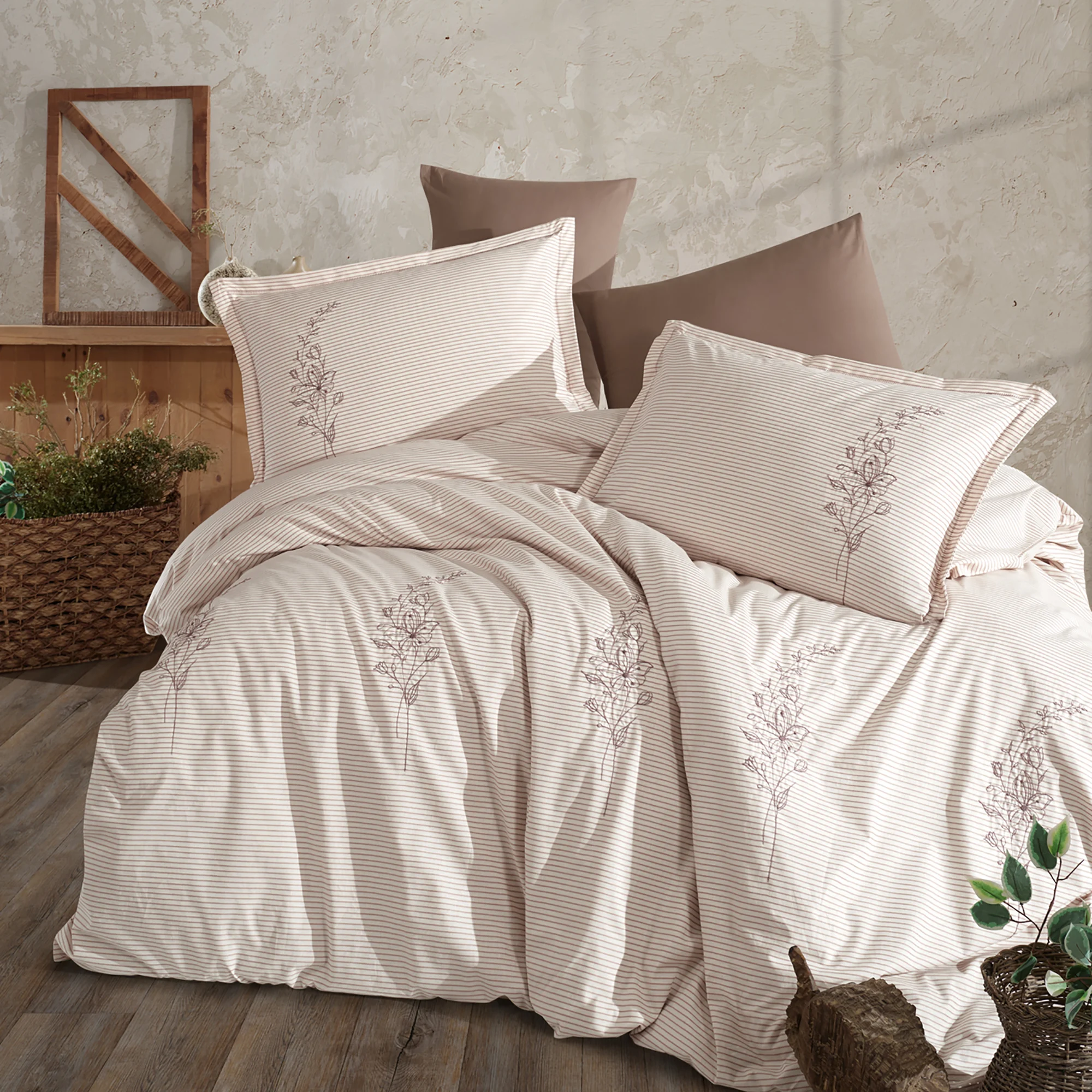 Lenjerie de pat din bumbac ranforce crem/maro cu flori(Eterna) pentru pat dublu,formata din 4 piese(cearceaf de pat fara elastic,husa pilota si 2 fete de perna),eleganta,simpla,perfecta pentru saltele cu dimensiunea de