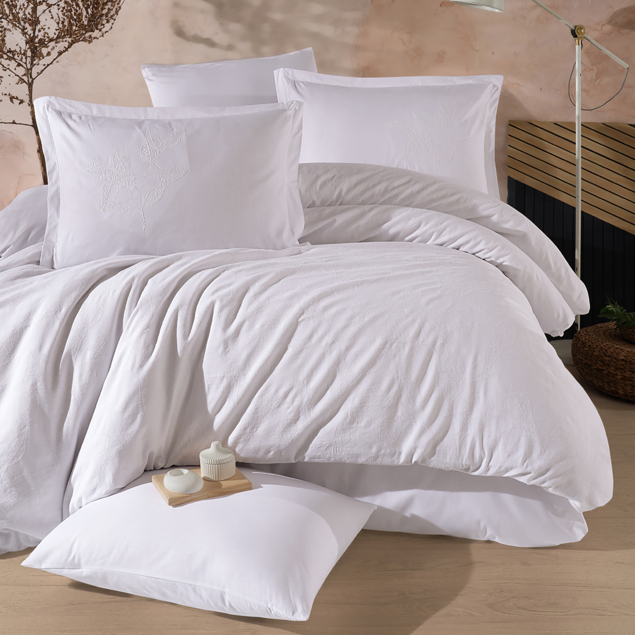 Lenjerie de pat MARLET V1 pentru pat dublu din bumbac 100%,tip tesatura jacquard,alba,satinata(satinare prin țesere, fără adăugarea altor fibre) cu o densitate de 140 gr./m2 compusă din 6 piese cu următoarele dimensiuni: