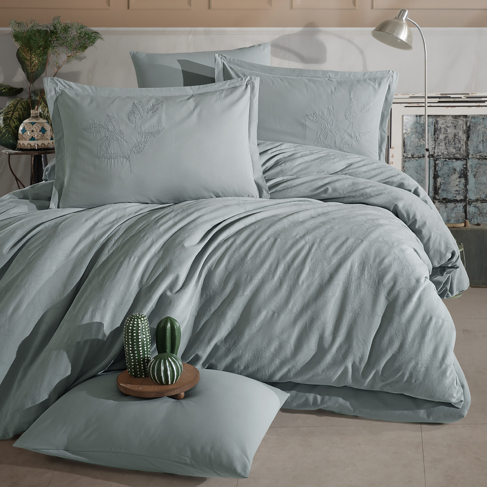 Lenjerie de pat MARLET V2 pentru pat dublu din bumbac 100%,tip tesatura jacquard,verde salvie,satinata(satinare prin țesere, fără adăugarea altor fibre) cu o densitate de 140 gr./m2 compusă din 6 piese cu următoarele dimensiuni: