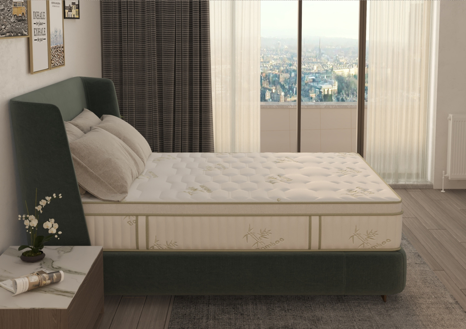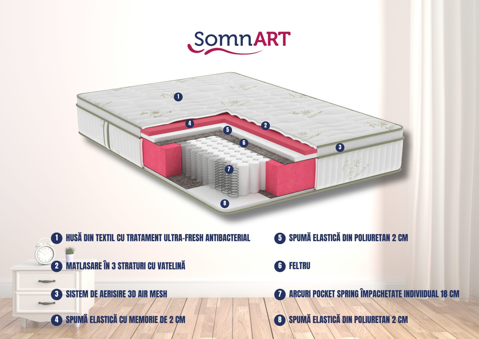 - Tricot de calitate superioară, matlasat și prevăzut cu sistem 3D Air Mesh pentru aerisire și tratament antibacterian cu Bambus, contribuind la eliminarea umezelii și prevenirea acumulării de acarieni.